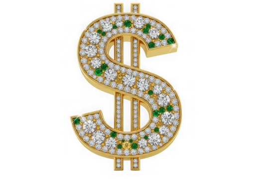 Golden dollar symbol with diamonds and emeralds isolated on transparent background