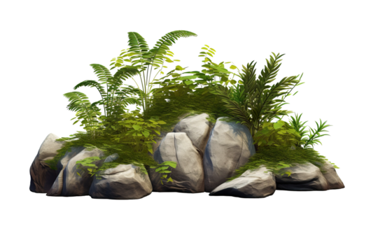 Cutout rock surrounded by plants. Decorative shrub for landscaping isolated PNG