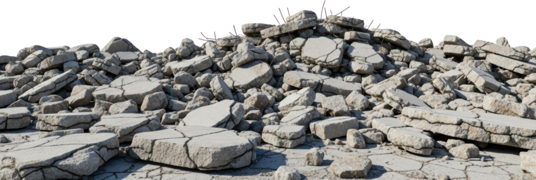 A pile of broken concrete debris with visible rebar cracked slabs and rubble isolated for