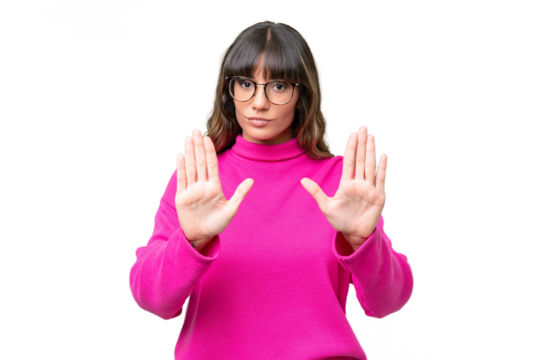 Young beauty woman over isolated chroma key background making stop gesture with her hand to stop an act