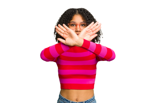 Young Asian woman over isolated chroma key background making stop gesture with her hand to stop an act