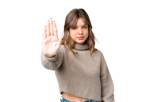 Young girl over isolated chroma key background making stop gesture