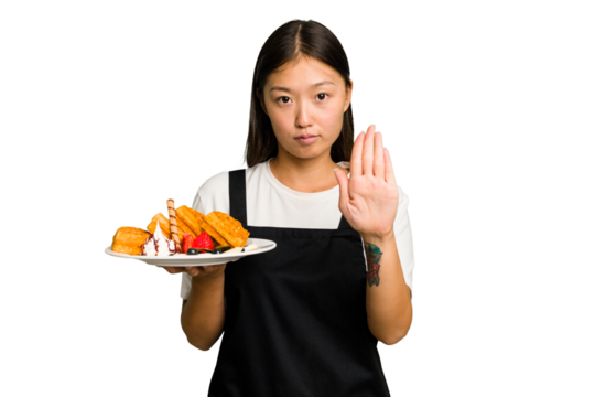 Young student Asian woman holding pizzas isolated on green chrome background standing with outstretched hand showing stop sign, preventing you.