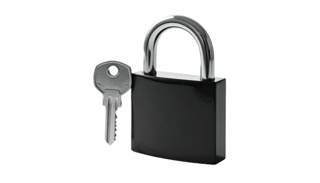 A close-up studio shot featuring a classic, metallic padlock beside its corresponding key, isolated on a stark black background