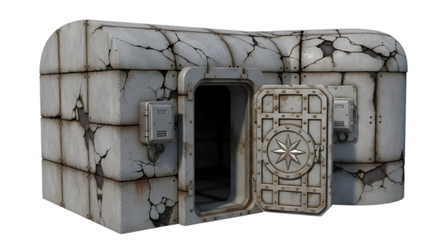 Weathered concrete safe with star emblem and open compartment isolated on a transparent background cracked