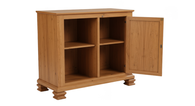 Isolated wooden cabinet with open door and shelves light brown