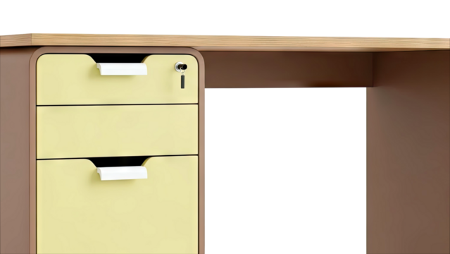Desk with light yellow drawers and a key