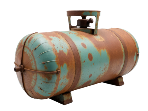 An old propane tank on a white background, perfect for use in backgrounds, textures or as a prop