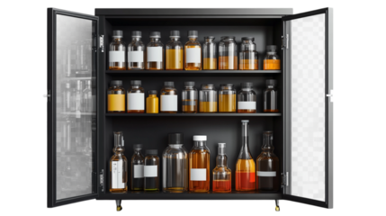 A chemical storage cabinet filled with safely organized reagent bottles on a transparent background