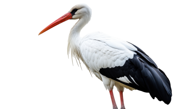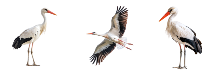 White stork collection, flying, portrait and standing, isolated on a transparent background