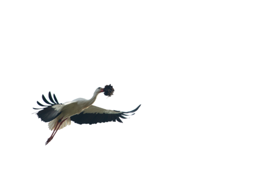 White stork with wings spread wide in mid-flight, elegant bird in motion symbolizing nature, freedom, and wildlife concept isolated on transparent background