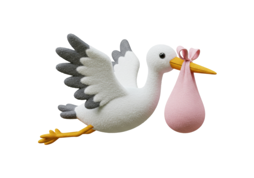 Isolated stork with pink bundle in beak delivering newborn baby for birth announcement