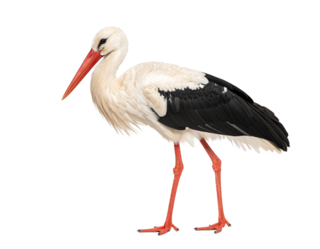 Isolated stork stands on one leg, showing off its long beak and black tipped wings