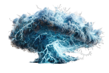 Dark storm cloud with lightning strikes PNG isolated on transparent background, dramatic weather effect for compositing and design use