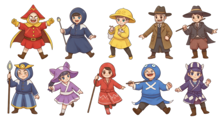 Colorful cartoon characters in whimsical outfits ready for fantasy adventure and imaginative storytelling