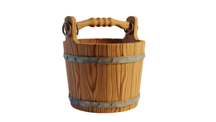 Handcrafted wood pail with metal hoops and carved grip on transparent