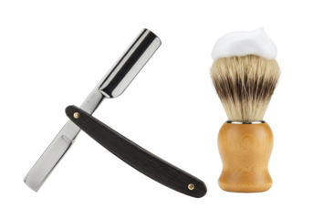 Barber's Straight Razor and Shaving Brush with Lather on Isolated White Background