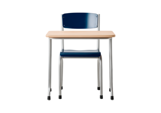 Simple wooden student desk with blue chair and metal legs on transparent background, PNG