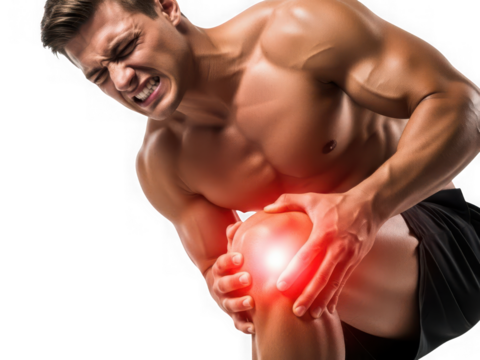 Muscular man experiencing intense knee pain and injury isolated on transparent background