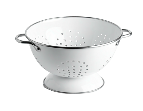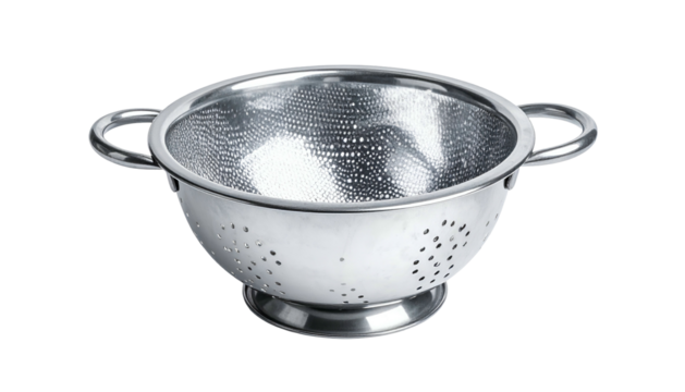Stainless steel colander with perforated design and two handles for straining liquids from food. isolated on white background and transparent background
