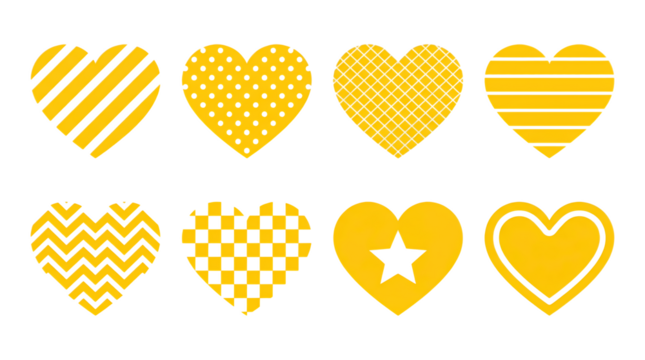 Yellow heart set including striped, polka dot, checkered, and star pattern variants isolated. Decorative love and romance graphic collection.