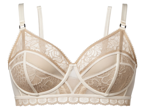 Elegant beige lace bra with adjustable straps on background for fashion product displays or catalogues featuring lingerie