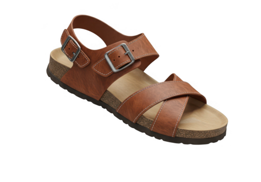 Stylish brown leather strappy wedge sandal for women isolated on transparent background