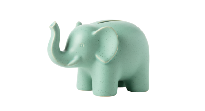 Mint green ceramic elephant coin bank isolated on white, cute animal figurine for kids room decor and savings concept