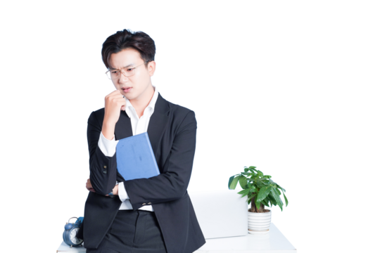 Contemplative Focus: A focused individual in business attire ponders an issue, resting a hand on their chin while holding a notepad, as they stand next to a desk and potted plant.