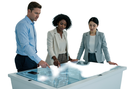Diverse business professionals collaborate around an interactive digital display table in a modern, bright office, strategizing future growth. Strategic business planning