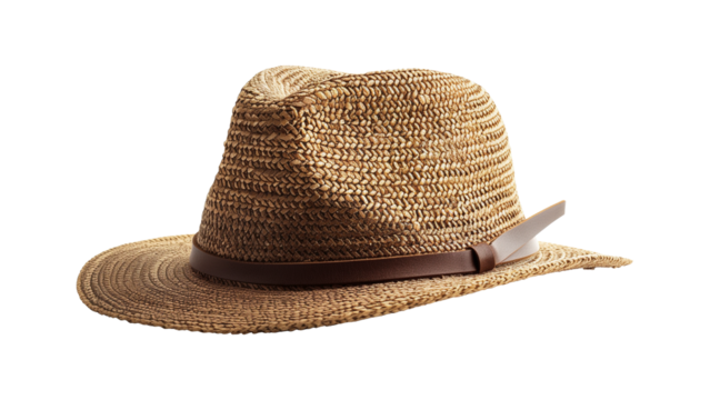 Stylish wide-brimmed straw sun hat with decorative ribbon isolated on transparent background for summer vacation cutout — high-resolution PNG perfect for travel-themed design and beachwear branding