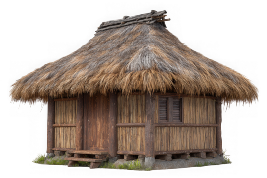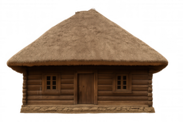 Wooden hut with thatched roof representing traditional rural architecture, isolated on transparent background, perfect for historical or cultural projects