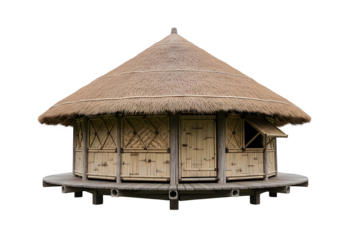 Traditional bamboo thatched roof hut with woven walls, elevated on wooden platform, rustic architecture, isolated on a transparent background