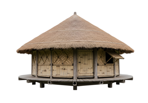 Round traditional hut with conical thatched roof, bamboo walls, elevated wooden base, rustic dwelling, isolated on white or transparent background. PNG