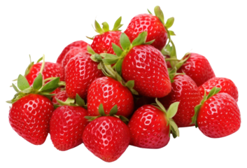 Set of ripe juicy strawberries, one of the berries is cut, there are strawberry leaves and flowers, isolated on a transparent background.