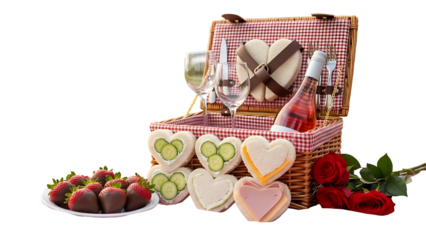 Romantic Valentine Picnic Basket with Heart Sandwiches, Chocolate Strawberries, and Rose
