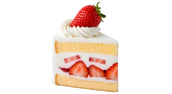 fresh strawberry shortcake slice with layers of vanilla sponge and whipped cream topped with whole strawberries isolated transparent background