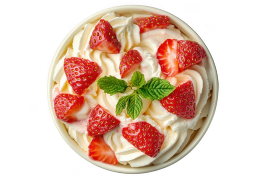 Delicious strawberry shortcake dessert topped with whipped cream and mint leaves stock photo, food photography, sweet treat, isolated on transparent background