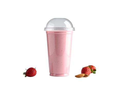 Refreshing strawberry smoothie with splash and toppings in a clear plastic cup on a transparent background Concept of healthy eating, summer drink, and delicious dessert