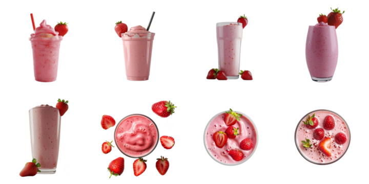 Strawberry smoothie collection in 3d png transparent for product presentation.