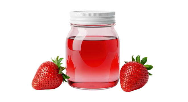 Strawberry smoothie in a mason jar with fresh strawberries and transparent background