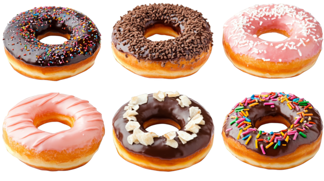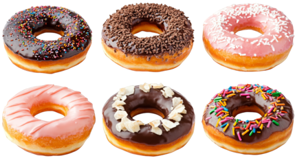 Delectable display of freshly baked donuts with colorful toppings and flavors delicious