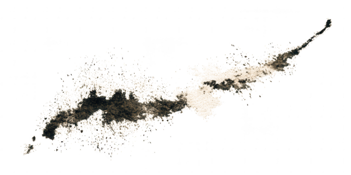 Abstract ring-shaped form on black background, with a dark, textured ring, and a trail of glittery particles streaming outward