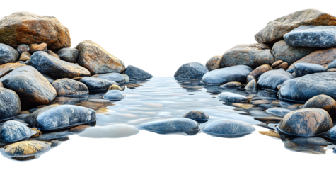 A tranquil stream flowing between smooth stones at sunrise isolated on transparent background
