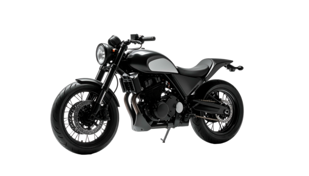 Sleek black & silver cafe racer motorcycle against a black background