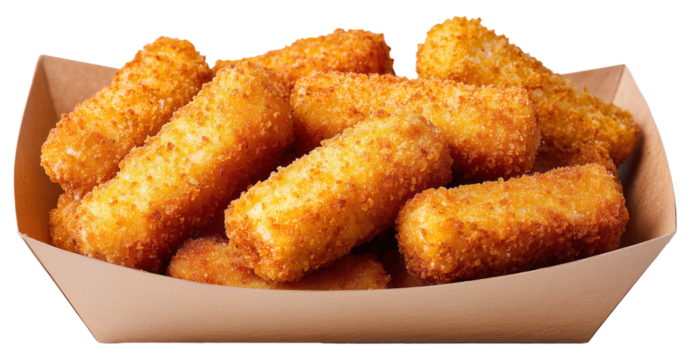 Delicious golden-brown crispy cheese sticks served in a paper tray isolated on transparent background.