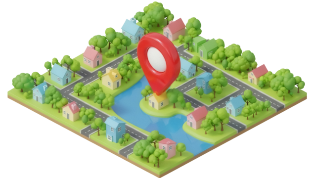 Digital city map illustration with location tags on transparent background