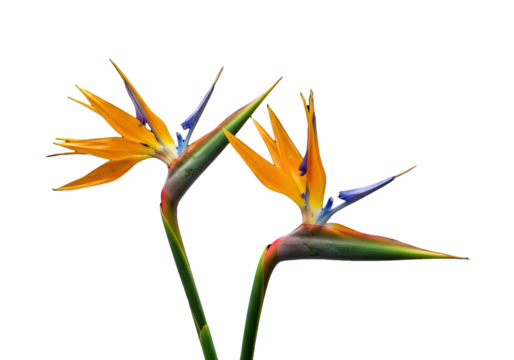 Beautiful orange bird of paradise flower (Strelitzia) with exotic blue and white petals, tropical bloom isolated on white for garden and nature beauty- Transparent Background