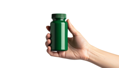 A person's hand holding a blank dark green plastic pill bottle, isolated on a white background for supplement or vitamin product mockups