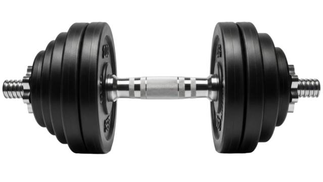 Adjustable dumbbell with multiple weight plates isolated PNG, fitness equipment for strength training and bodybuilding on transparent background
